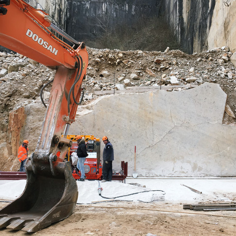 Our Aurisina quarry is an open-pit quarry whose stoping starts when levels are identified. Each of these levels has two faces that are created by means of diamond wire cuts. When a level is ready, it is split into benches that will be subject to tilting and, once on the ground, cut into blocks.